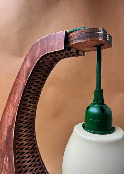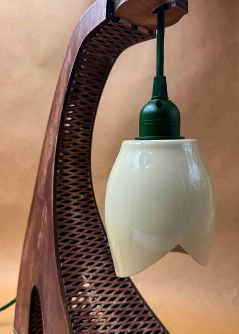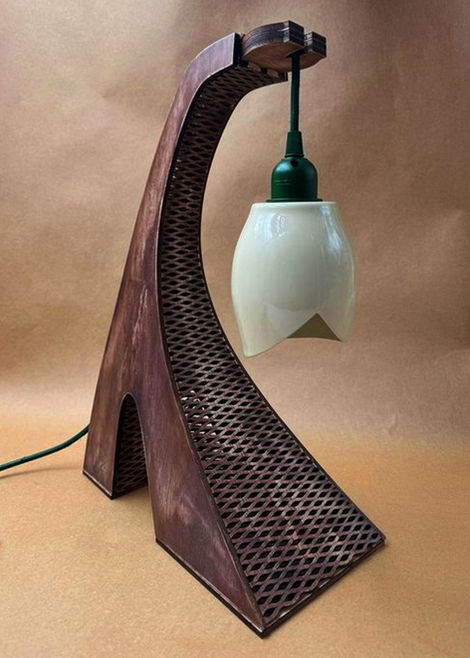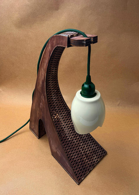 This lamp shade was made from vacuum-formed plastic over a wooden buck made on a lathe. The two plastic halves come together at a smooth, Bondo-filled seam. The stand is laser-cut and stained plywood.